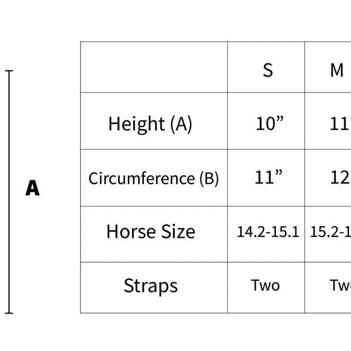 A horse under 15.1 will wear Small in front, Medium behind; a horse 16h-17h will wear Medium in front, Large behind; a horse 17.2+ or very large boned will wear large front, XL hind.
