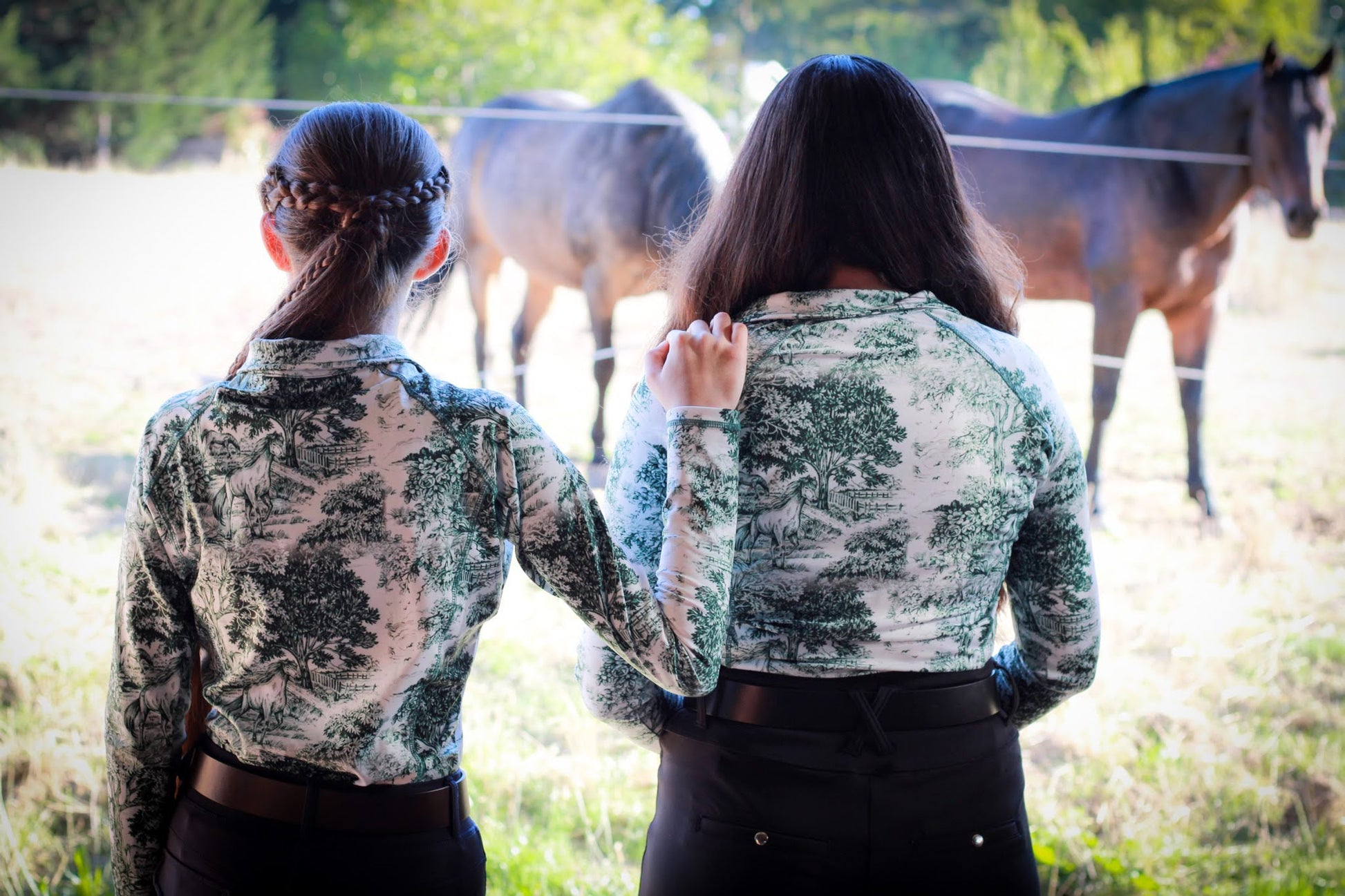 The Green Equestrian Toile Riding Shirt. -The Manor Ride - captures the romance of pastoral landscapes and the artistry of equestrian life, rendered in a graceful, storybook print. This lovely shirt is crafted from premium Italian Carvico fabric, and offers durability, breathability, and UV protection. It's wrinkle-resistant, machine washable material ensures you look sharp effortlessly, ride after ride.