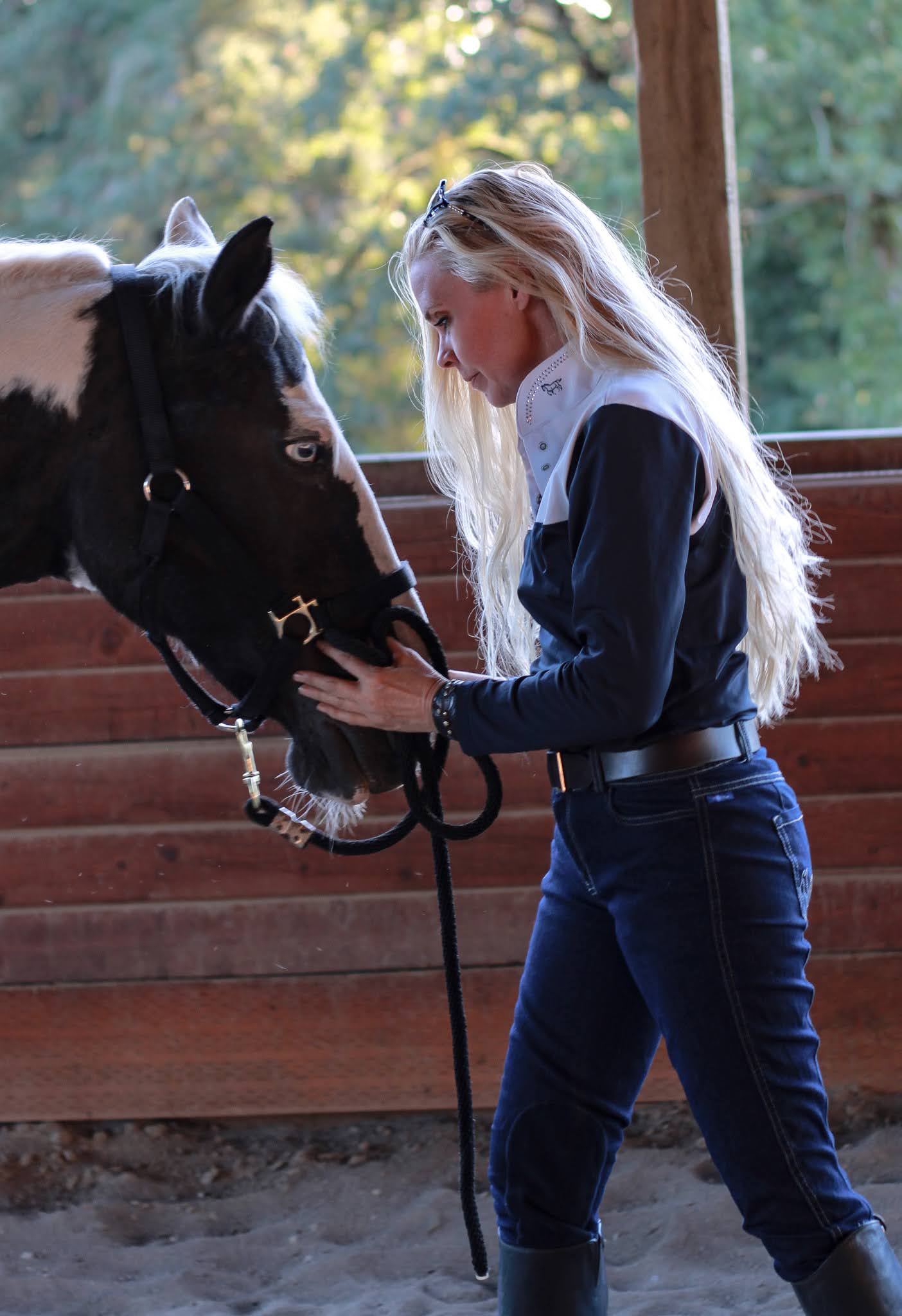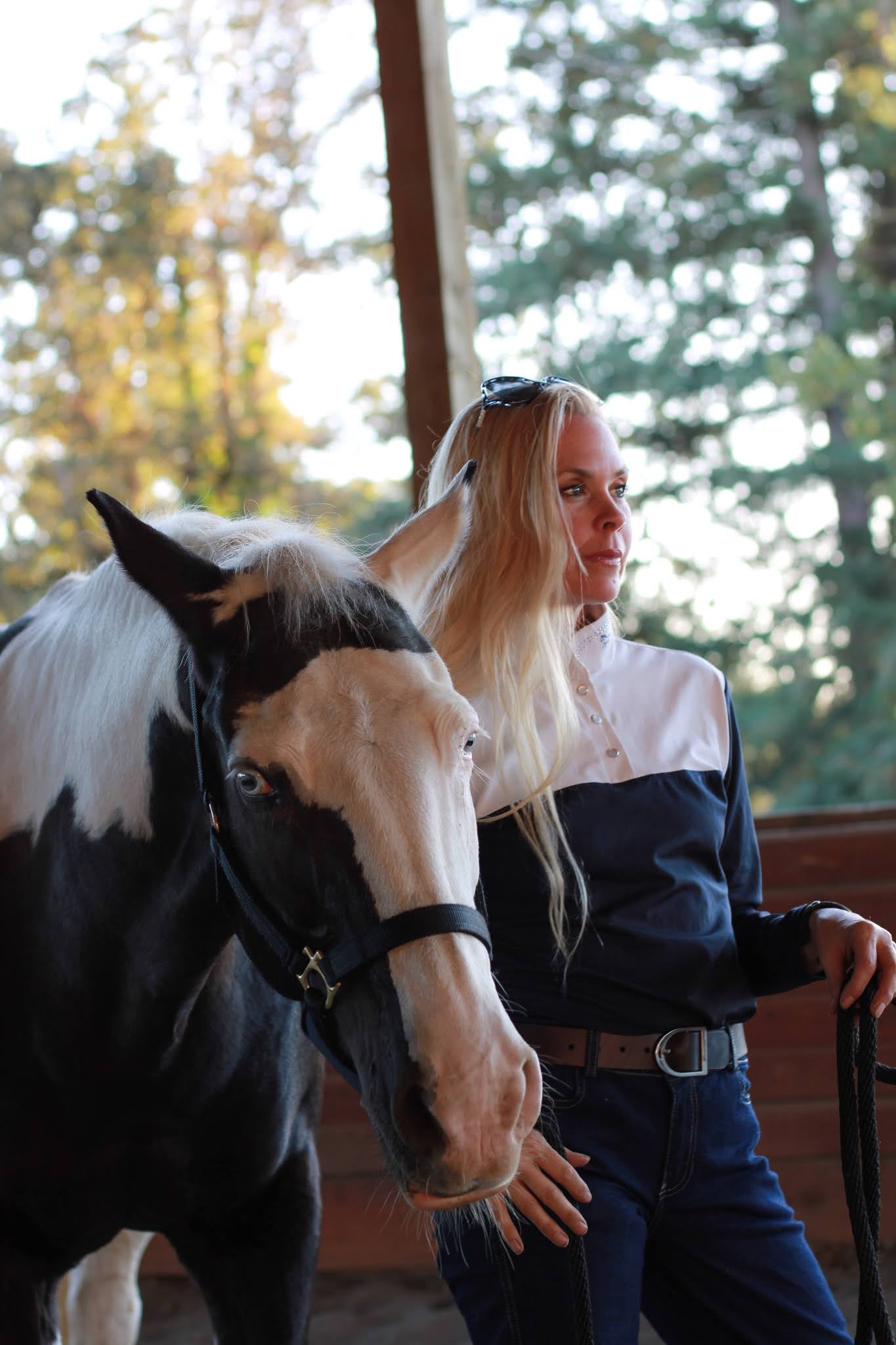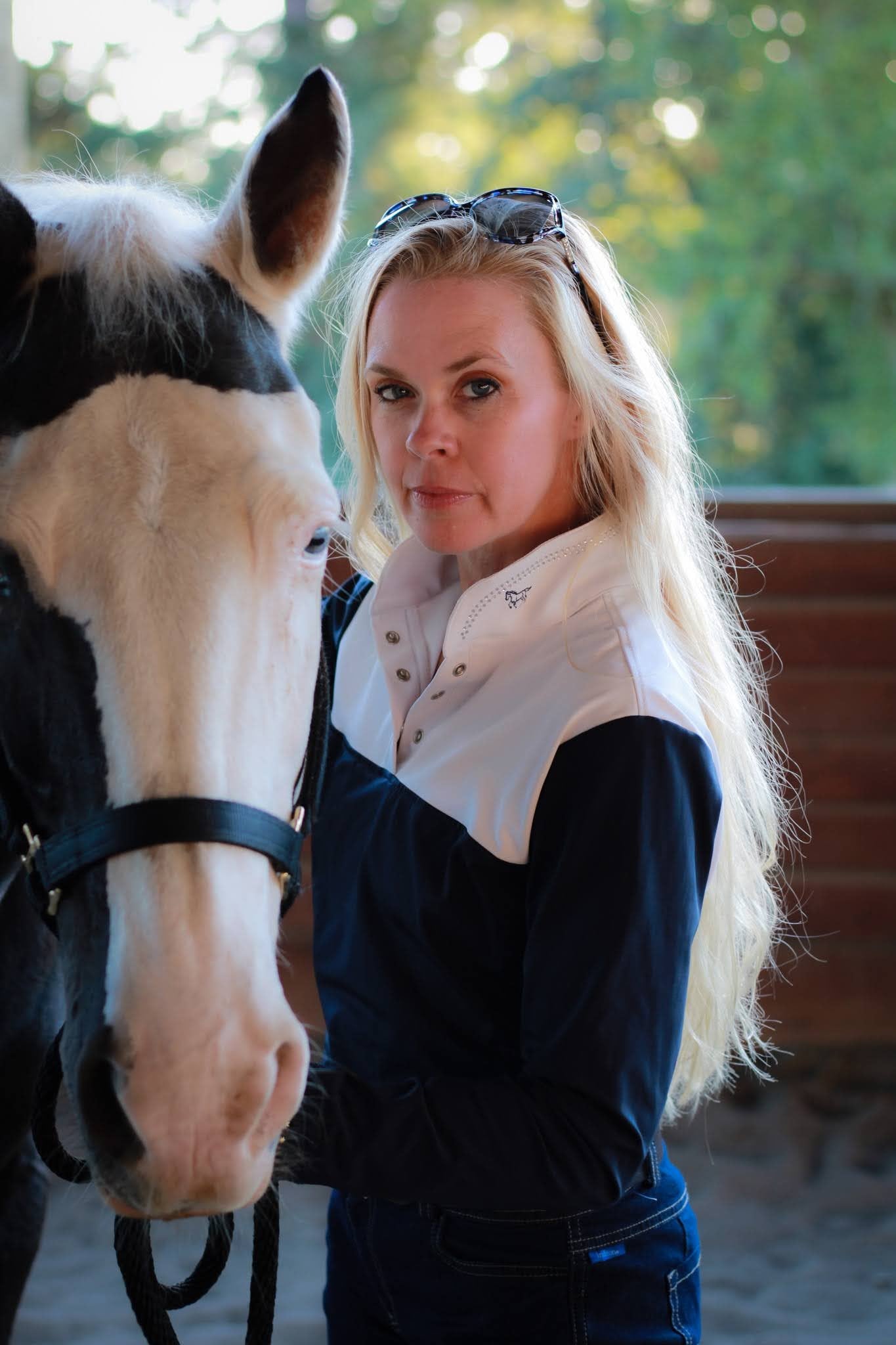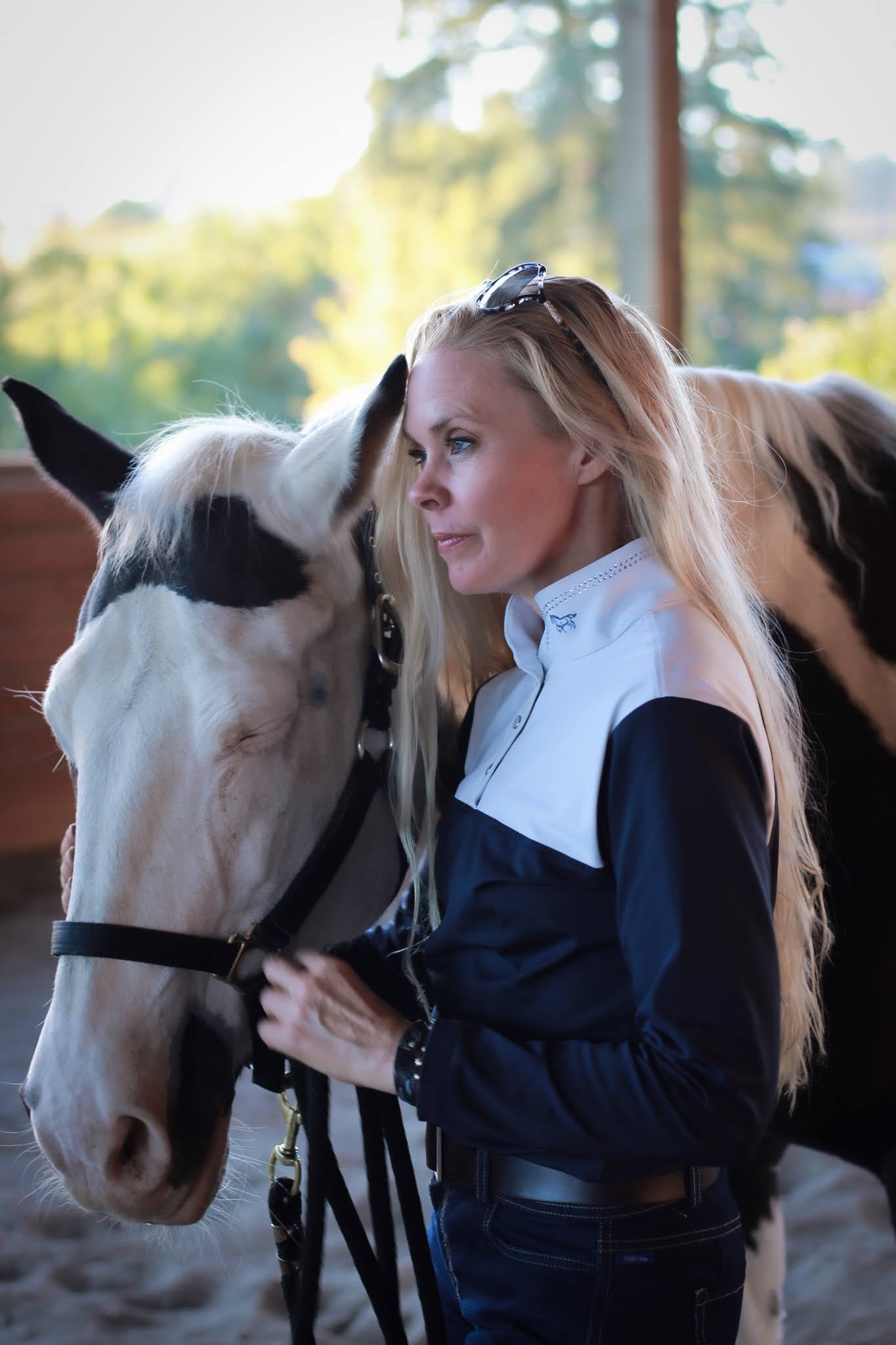 Our women's equestrian Legacy Show Shirt in white and navy blue combines elegance with performance. Made from the beautiful Italian Carvico fabric, it offers superior durability, breathability, and wrinkle resistance for all-day comfort. The hidden snap closures provide a sleek, polished look, while the classic design ensures you'll stay stylish in the ring. Perfect for riders who demand both functionality and sophistication.